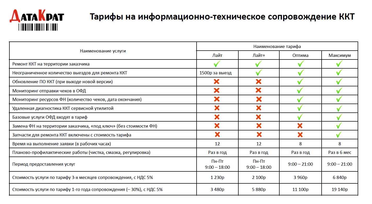 Мы предлагаем несколько тарифов сопровождения ККТ: от минимального — для тех, кто в теме, но хочет подстраховку, до полного — с выездом, поддержкой и регулярными проверками.